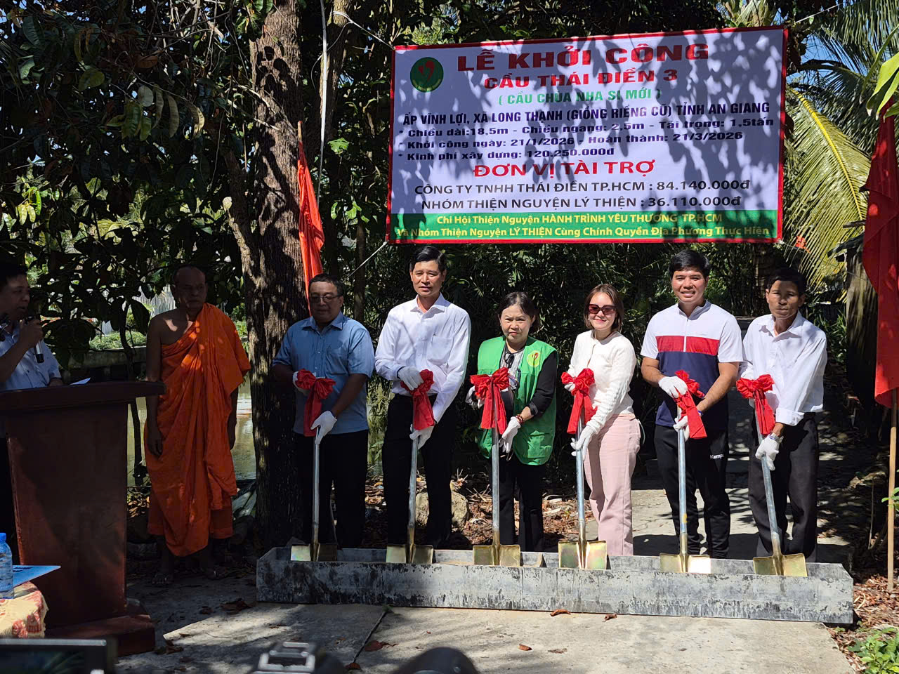 Tại buổi lễ, các đại biểu đã thực hiện nghi thức động thổ trong không khí phấn khởi của những ngày giáp Tết Nguyên đán 2026. Sự kiện khởi công cầu Chùa Nha Si mới một lần nữa khẳng định tinh thần đoàn kết, chung tay của các mạnh thường quân và chính quyền xã Long Thạnh trong công tác an sinh xã hội tại địa phương.
