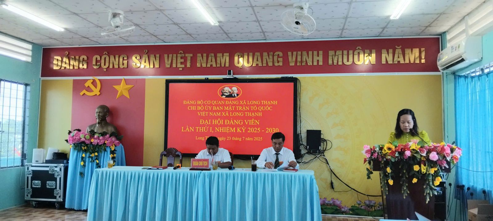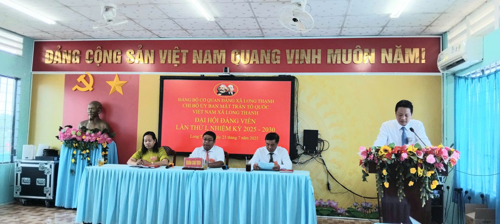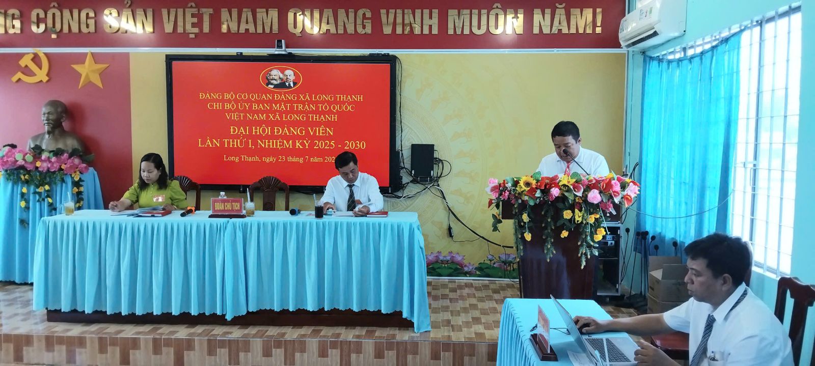 Đại hội đã bầu Đoàn Chủ tịch gồm 3 đồng chí và Thư ký Đại hội, thông qua đầy đủ nội dung chương trình và quy chế làm việc. Tại Đại hội, các đại biểu đã nghe và thảo luận các báo cáo quan trọng như: Báo cáo chính trị của Chi bộ nhiệm kỳ 2025–2030; Báo cáo tổng hợp ý kiến đóng góp vào dự thảo Văn kiện Đại hội toàn quốc lần thứ XIV của Đảng và các văn kiện Đại hội cấp trên. Phát biểu chỉ đạo tại Đại hội, đồng chí Trần Ngọc Khải ghi nhận, biểu dương tinh thần trách nhiệm, sự chuẩn bị nghiêm túc của Chi bộ và định hướng thêm một số nội dung quan trọng để Chi bộ tiếp tục phát huy vai trò lãnh đạo trong giai đoạn mới. Đại hội cũng đã công bố quyết định thành lập Chi bộ Ủy ban MTTQ Việt Nam xã Long Thạnh và chỉ định Ban Chấp hành gồm các đồng chí: Danh Tuấn – Bí thư Chi bộ, Huỳnh Văn Khánh – Phó Bí thư và Thị Mỹ Diên Hạnh – Chi ủy viên.