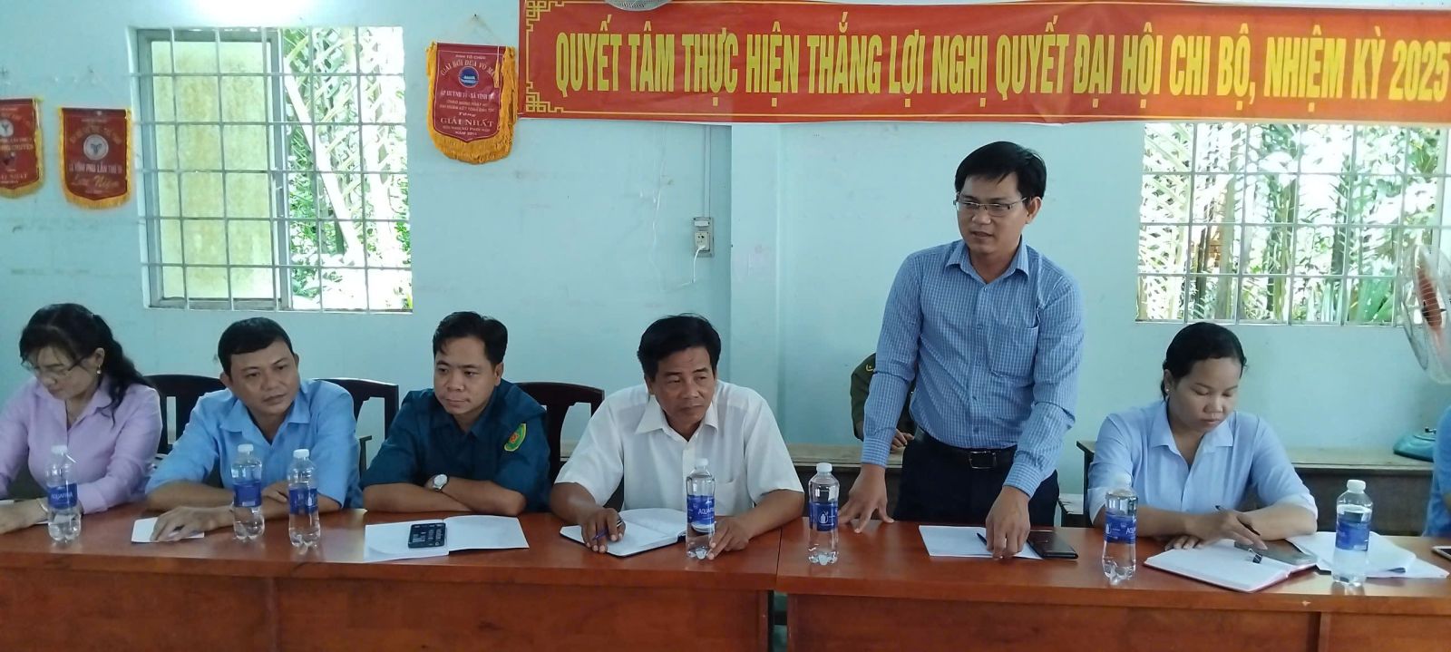 Tham dự với đoàn có đồng chí Trần Ngọc Khải, phó bí thư thường trực - Chủ tịch HĐND; Đồng chí Huỳnh Văn Thái Quỳnh, Phó Bí thư đảng ủy - Chủ tịch UBND xã; đại diện lãnh đạo UB. MTTQVN xã, cùng các đồng chí trưởng, phó các Ban ngành, đoàn thể xã. Nhằm nắm bắt tình hình thực hiện nhiệm vụ 6 tháng đầu năm 2025 tại địa phương. Đoàn công tác đã nghe đại diện 2 chi bộ báo cáo kết quả công tác từ đầu năm đến nay, phân tích thuận lợi, khó khăn và các kiến nghị nhằm thúc đẩy phát triển kinh tế - xã hội.