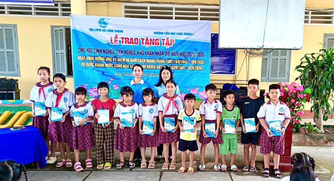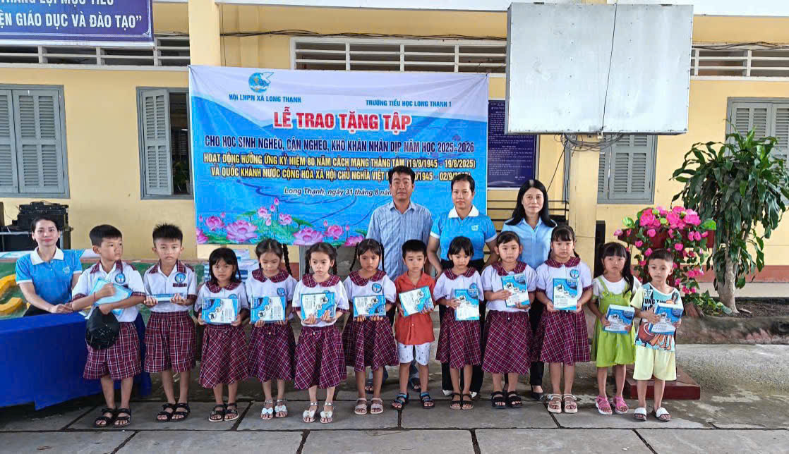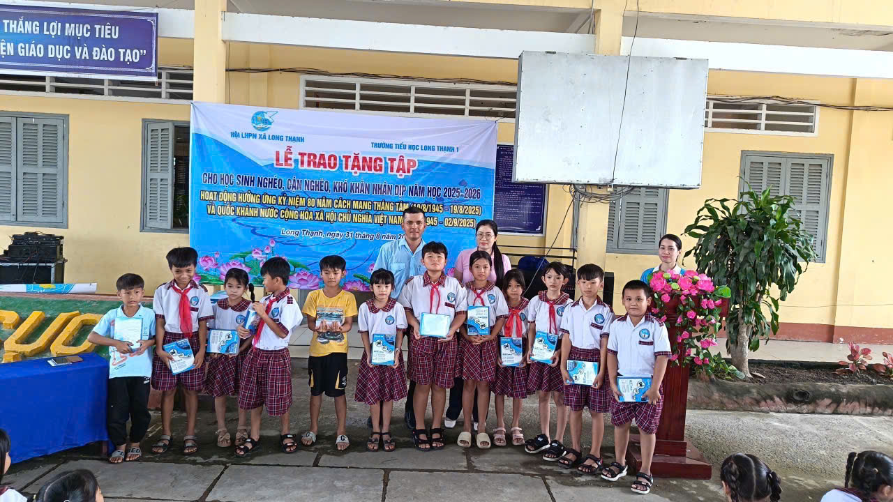 Trong chiều cùng ngày, Hội LHPN xã cũng đã phối hợp với Ban Giám hiệu trường Tiểu học Long Thạnh 1 tổ chức Lễ trao tặng 510 cuốn tập cho các em học sinh có hoàn cảnh khó khăn trị giá 4.000.000 đồng, với phương châm “không để ai bị bỏ lại phía sau”; thể hiện sự quan tâm của các cấp Hội Liên hiệp phụ nữ đối với các em học sinh có hoàn cảnh khó khăn trên địa bàn xã Long Thạnh.