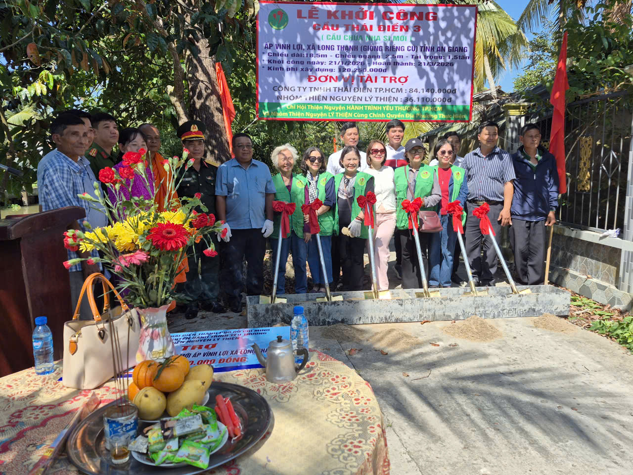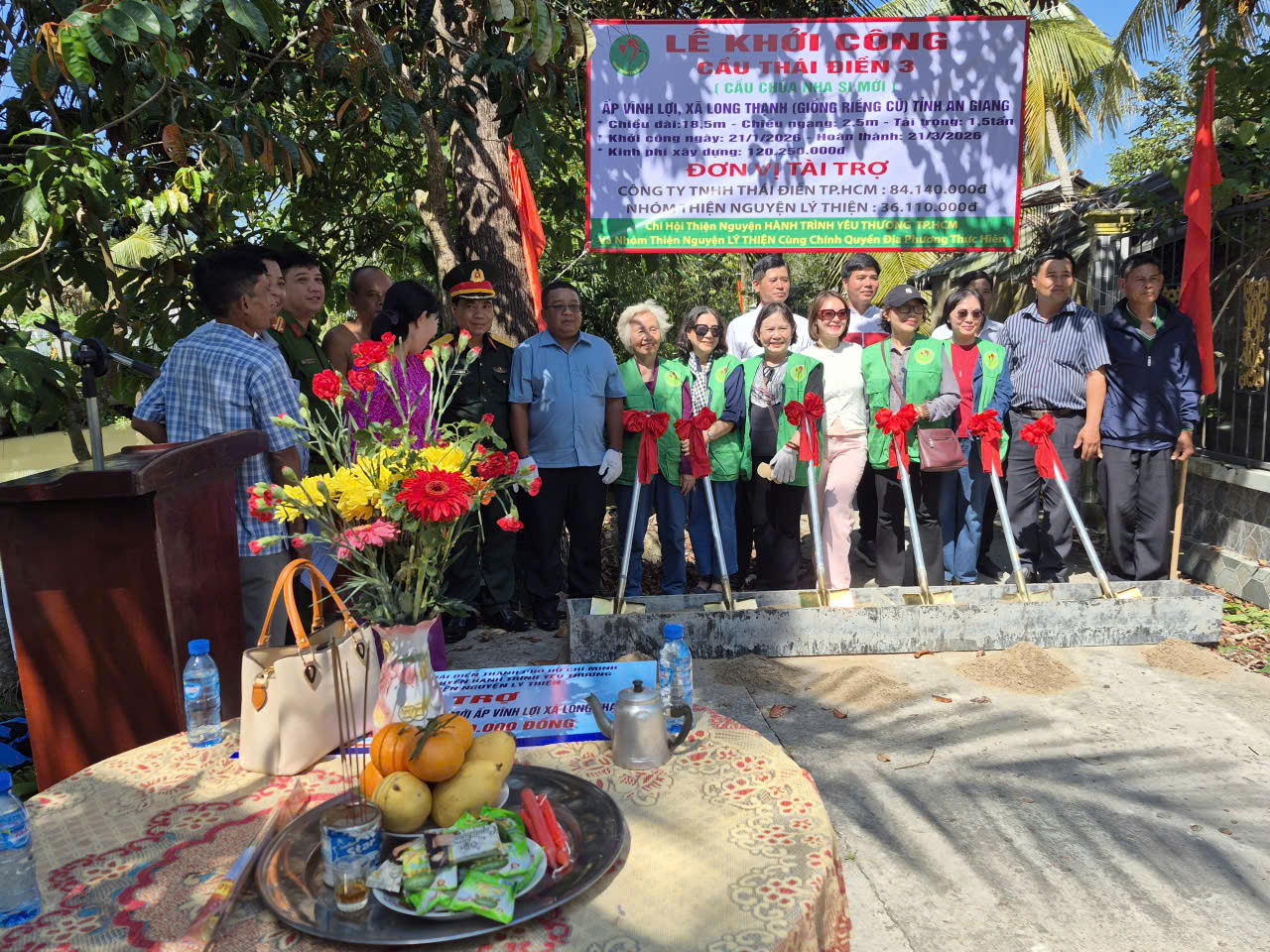 Tại buổi lễ, các đại biểu đã thực hiện nghi thức động thổ trong không khí phấn khởi của những ngày giáp Tết Nguyên đán 2026. Sự kiện khởi công cầu Chùa Nha Si mới một lần nữa khẳng định tinh thần đoàn kết, chung tay của các mạnh thường quân và chính quyền xã Long Thạnh trong công tác an sinh xã hội tại địa phương.