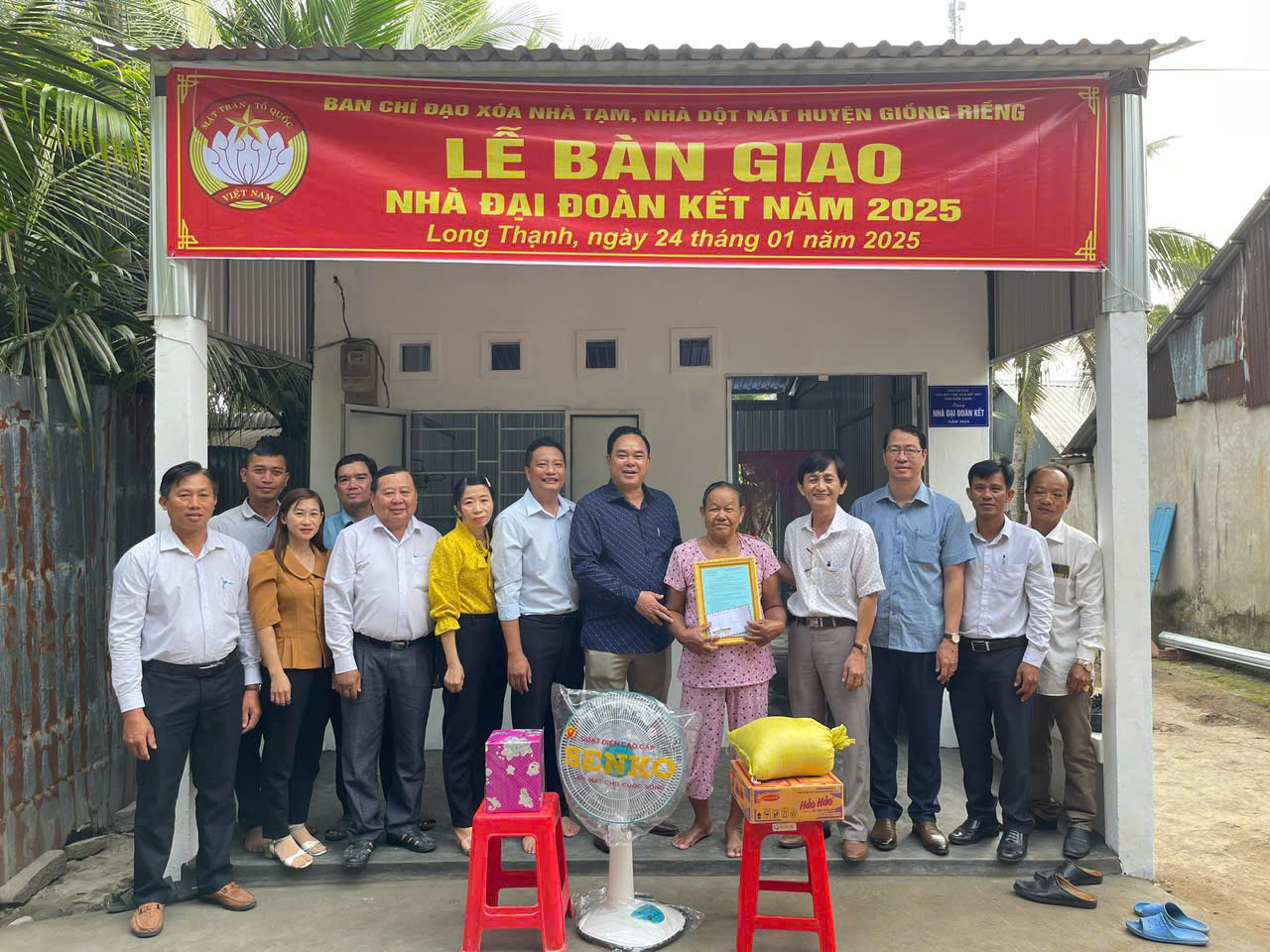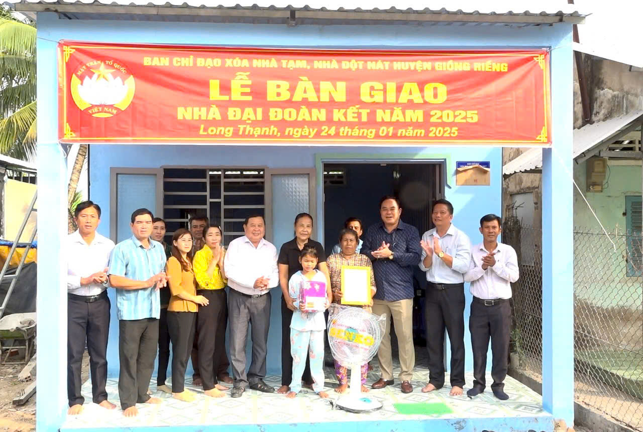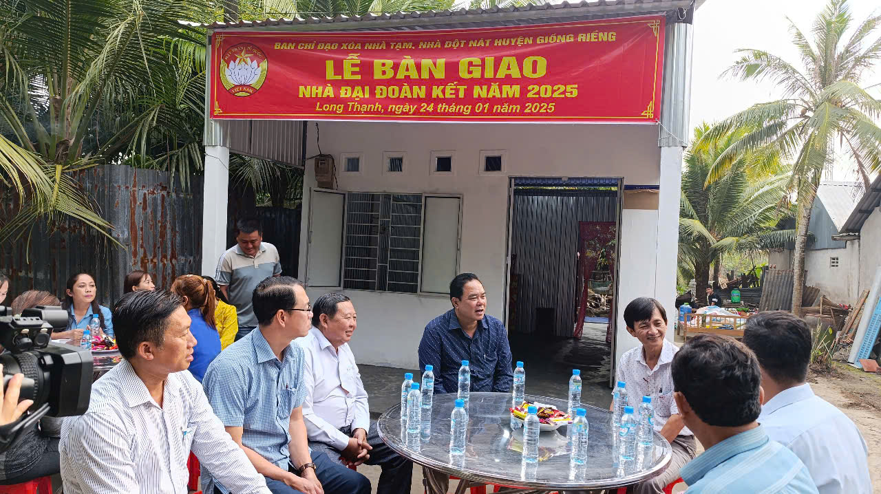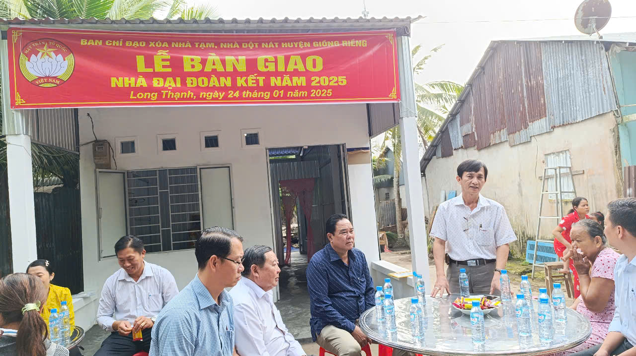Phát biểu tại lễ bàn giao các căn nhà đại đoàn kết, đồng chí Trần Minh Thể, Tỉnh ủy viên-Bí thư Huyện ủy-Trưởng Ban Chỉ đạo “Xóa nhà tạm, nhà dột nát” huyện Giồng Riềng chúc mừng các gia đình được hỗ trợ nhà ở có được ngôi nhà mới khang trang hơn so với trước đây để vào ở trước Tết Nguyên đán Ất Tỵ năm 2025. Trước thềm năm mới chúc gia đình luôn mạnh khỏe, vui vẽ, hạnh phúc và năm mới đón Tết với một mùa xuân vui tươi và đầm ấm. Bên cạnh đó cũng thăm hỏi, tặng quà và động viên các gia đình tích cực lao động, sản xuất, phát triển kinh tế để vươn lên thoát nghèo, xây dựng cuộc sống ngày càng tốt hơn.